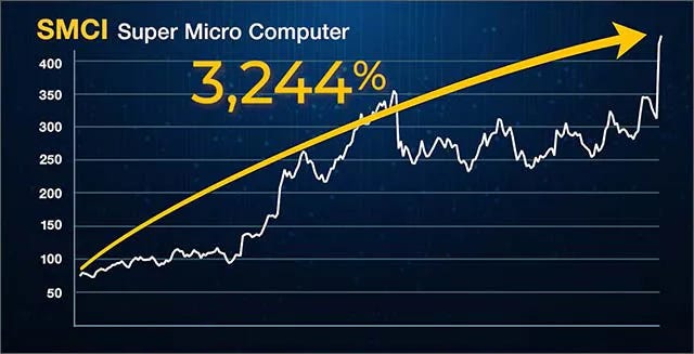 And Super Micro Computer, whose stock has surged as much as 3,244%.